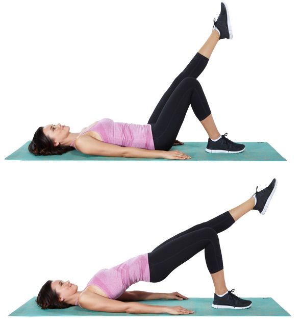 Em decubito dorsal com apenas um apoio e a perna contrária em suspensão e extensão, deverá realizar a elevação da bacia, o exercicio deverá ser repetido no membro oposto.