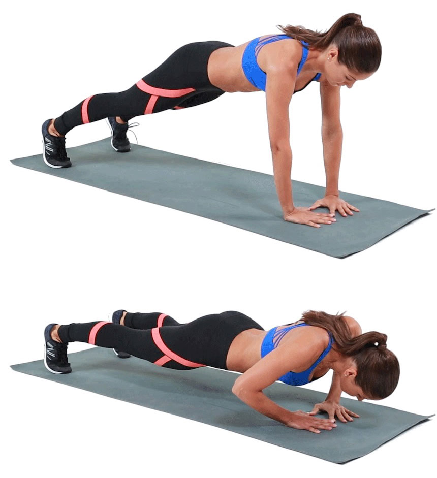 Posição de prancha com o apoio das mãos à largura dos ombros deverá fazer a flexão braços sem afastar os cotovelos do tronco