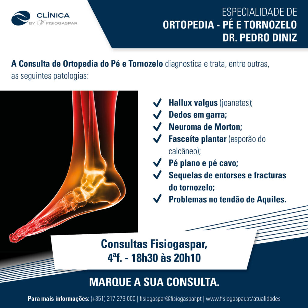 Nesta área contamos com o Dr. Pedro Diniz, Ortopedista interno da Fisiogaspar, especialista em cirurgia do pé e tornozelo.