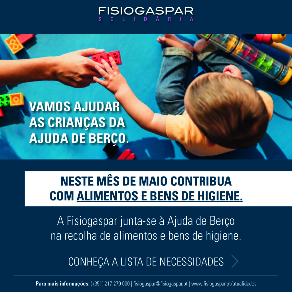 Durante o mês de maio a Fisiogaspar em parceria com a Ajuda de Berço está a promover uma Campanha de Angariação de Bens Alimentares e Higiene.